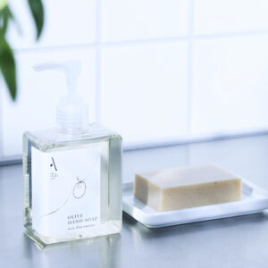 液体であるオリーブハンドソープは、オリーブポマスからエキスを抽出し、手肌を整える成分として配合しました。1日に何度も洗う手をすっきりと、やさしく洗い上げる処方です。